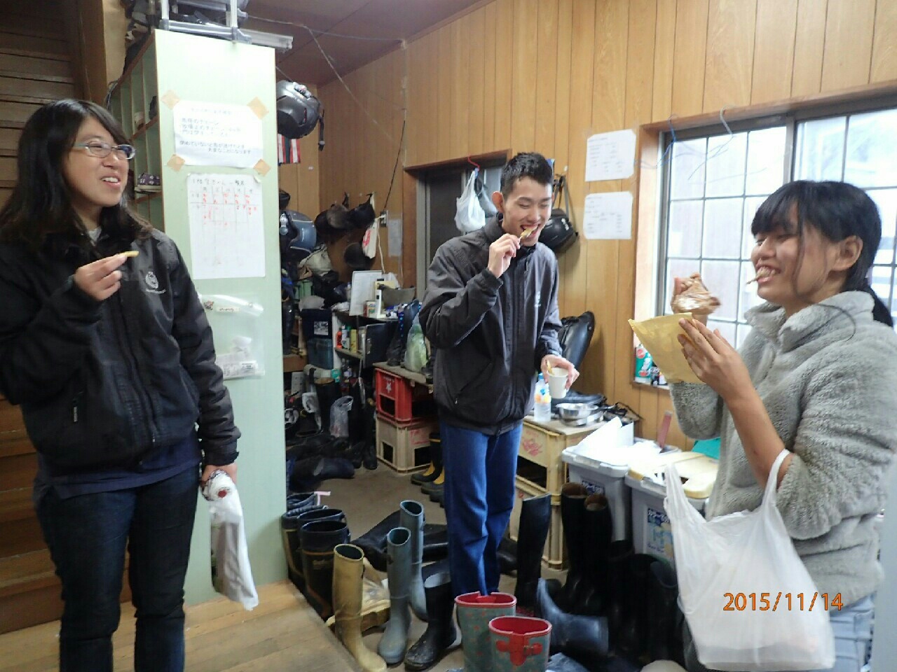 裏で差し入れを食べる(左から)唐内先輩、高橋、橘