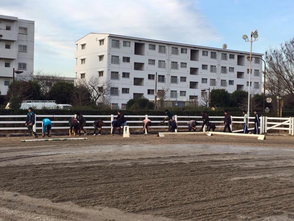 最近の馬術部は朝は馬場が凍ってしまい馬の運動が出来ないので人間が運動をしています!