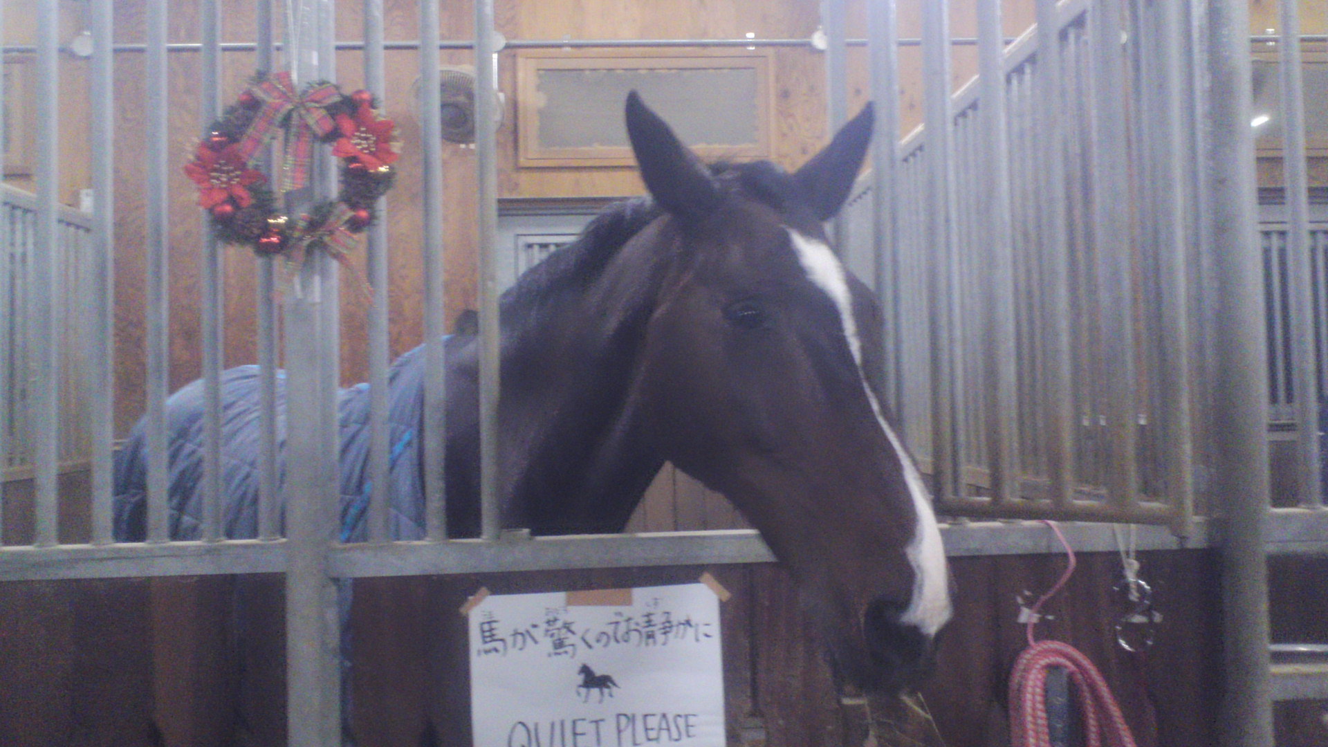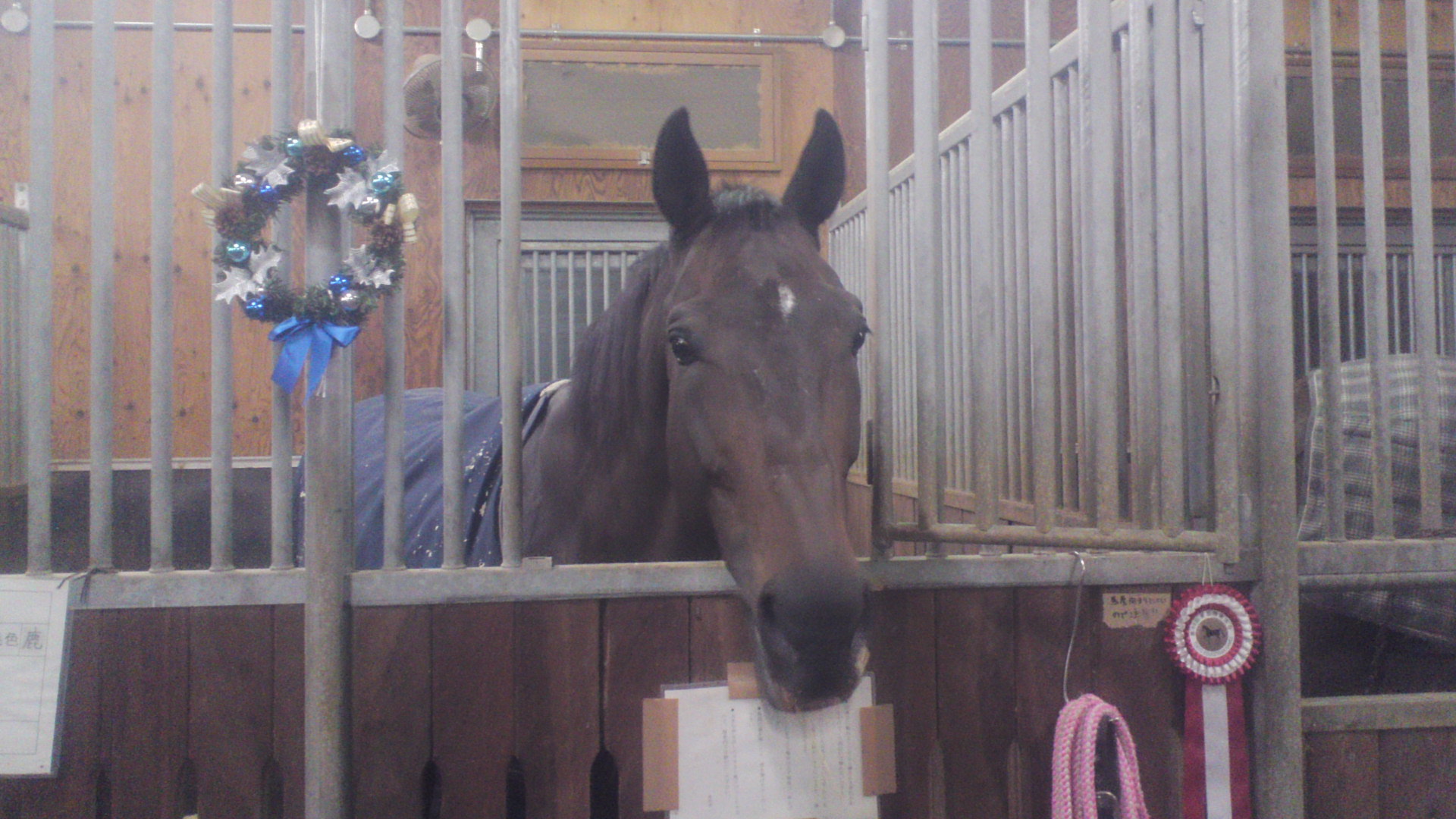 クリスマスが近づき、厩舎内にリースがかかりました!
