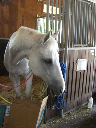 ただ、馬房の前に用意してあるエサが入ったバケツを首を精一杯伸ばして狙ってます・・・・