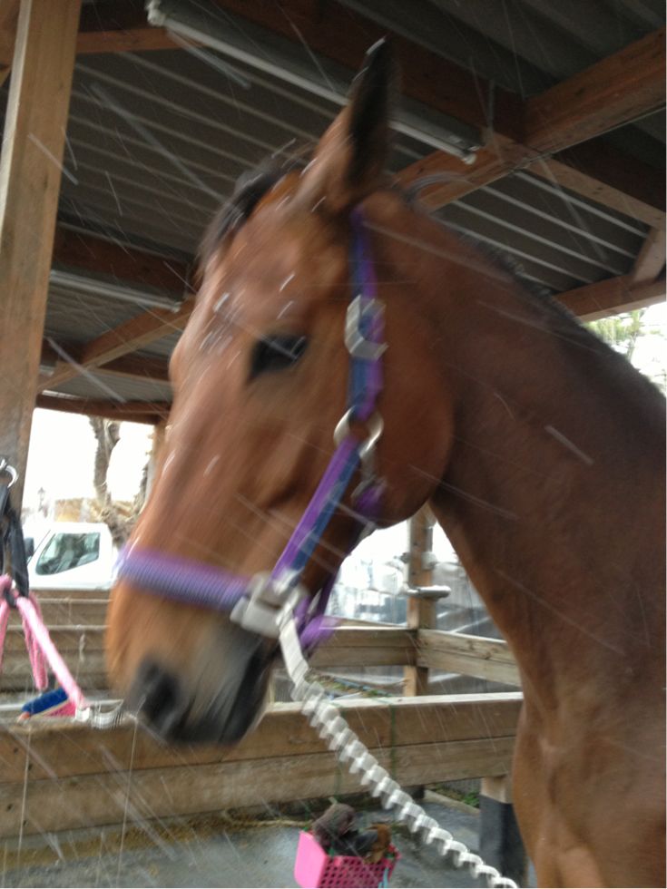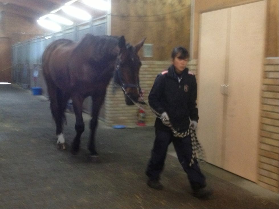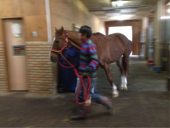 さて、今日は運動も出来ないので厩舎内で引き馬です!
